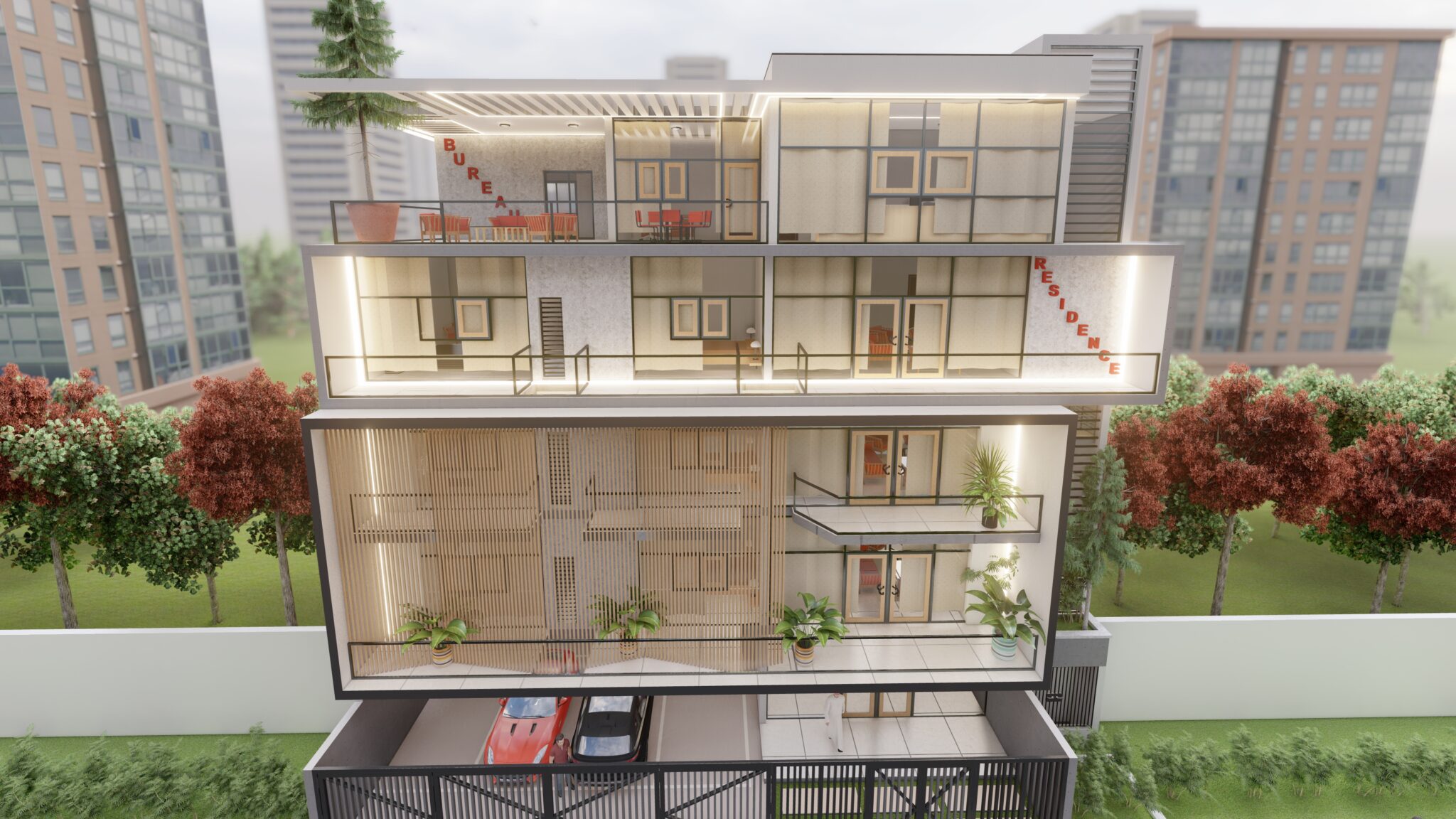 Les 3 premiers niveaux sont constitués d’appartements de haut standing et modernes. Et le dernier Étage, est un Espace Bureau Élégant et Lumineux !